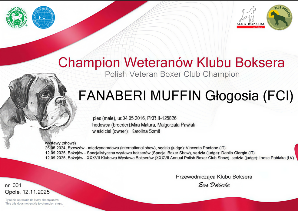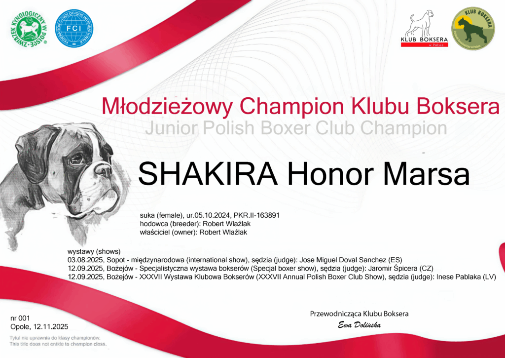 W imieniu Klubu Boksera gratulujemy OGROMNEGO SUKCESU i mamy nadzieję, że Pański team nie powiedział ostatniego słowa. Bardzo doceniamy wielką pracę, jaką Pan włożył w wyszkolenie tych psów, które zaowocowało najwyższym miejscem na podium.